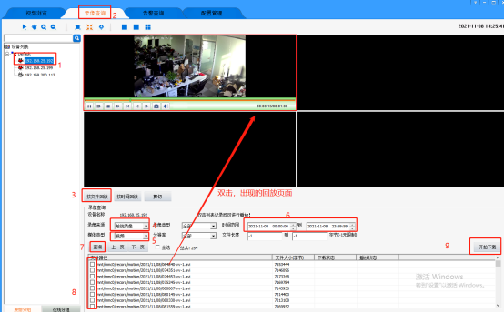 7、点击“查询”。会出现选择的时间段内所有的回放文件,可以通过该工具下载录像。也可以双击文件进行录像回放,如果需要下载,进行以下步骤: